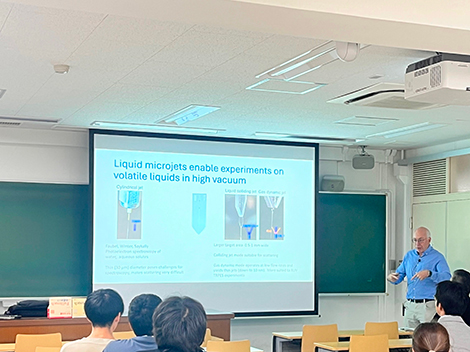 10月30日(木)、カリフォルニア大学バークレー校のDaniel Neumark教授をお招きして、化学本館2階講義室にて第2012回雑誌会セミナーが開催されました。Neumark先生には、“Spectroscopy and scattering experiments on flat liquid jets”の題目でご講演いただきました。